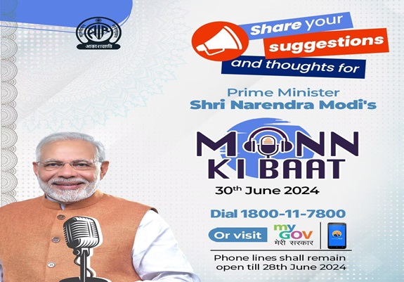 પ્રધાનમંત્રીશ્રી નરેન્દ્ર મોદીએ મન કી બાત કાર્યક્રમના જૂન, 2024ના એપિસોડ માટે વિચારો અને ઇનપુટ્સ આમંત્રિત કર્યા