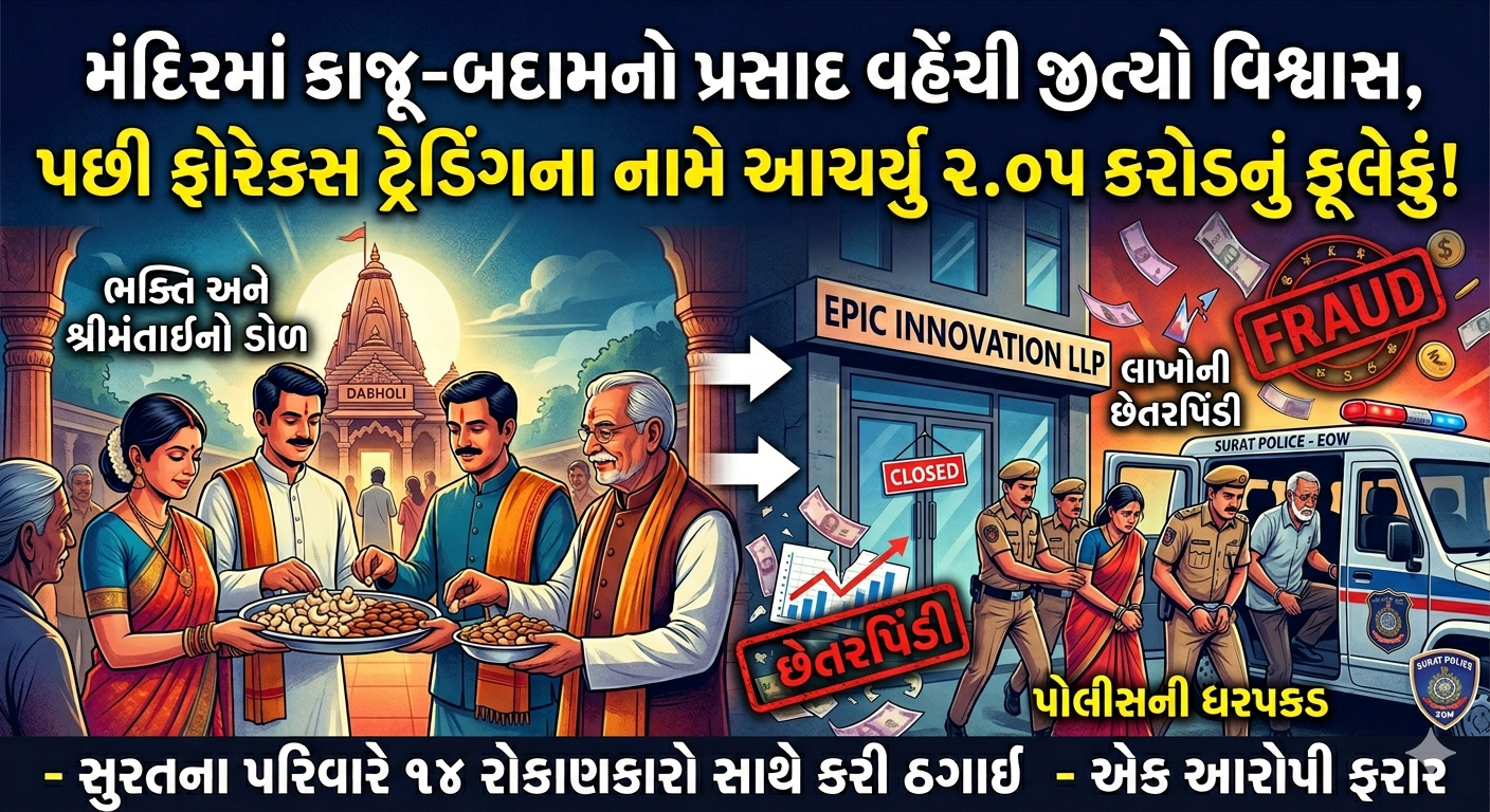 સુરત શહેરમાં રોકાણના નામે લાખોની છેતરપિંડીના કિસ્સાઓ વધી રહ્યા છે, ત્યારે સુરત પોલીસની આર્થિક ગુના શાખા (EOW) એ એક એવા પરિવારની ધરપકડ કરી છે જેણે ફોરેક્સ ટ્રેડિંગમાં ઊંચા વળતરની લાલચ આપી ૧૪ થી વધુ લોકો સાથે રૂ.૨.૦૫ કરોડની ઠગાઈ આચરી છે.