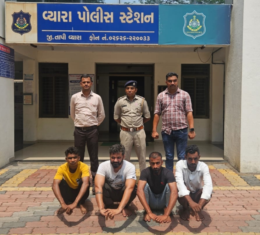 વ્યારા નગરનાં સ્ટેશન રોડ વિસ્તારમાં દરગાહની બાજુમાં રહેતા શકિલમિયા અબ્દુલહમીદ શેખના ઘરમાંથી સોનાના દાગીના તથા રોકડ રકમની ચોરી કરનાર ચાર આરોપીને પોલીસે ગણતરીના કલાકોમાં જ